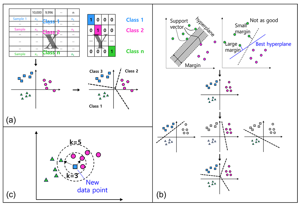 Fig. 1. Visualization of machine learning model (a: PLS-DA, b: SVM, c: KNN) (inspired Jang et al. 2020).